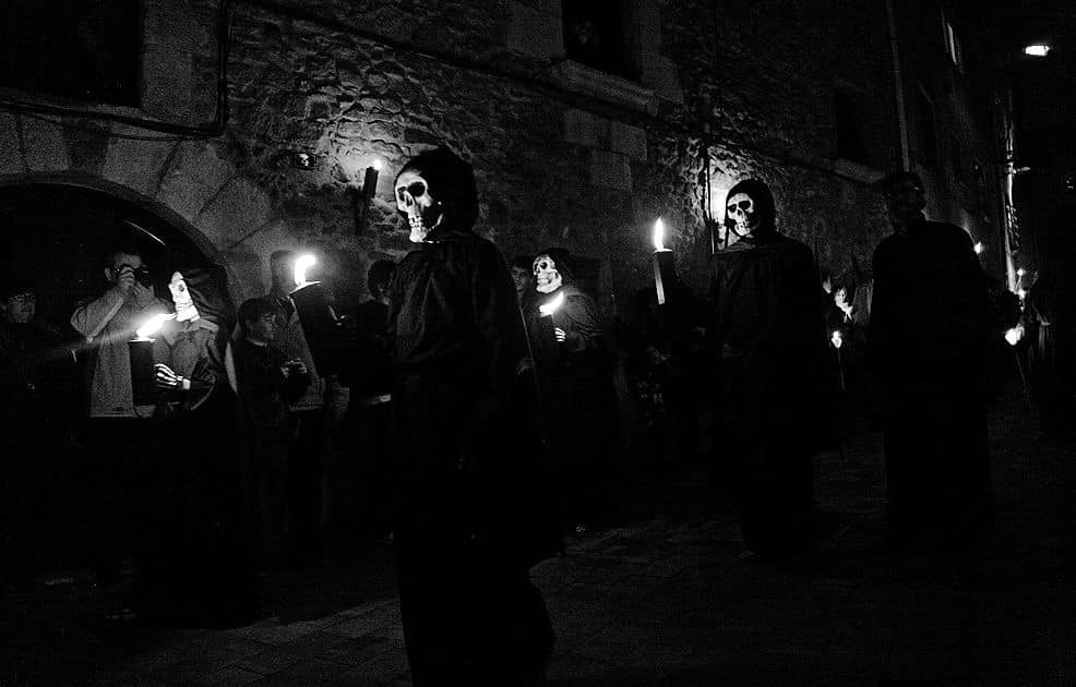 La danza de la muerte era muy popular en la Europa medieval. Verges, en Girona, es el único que aún mantiene viva la tradición hoy en día. La noche del Jueves Santo, cinco esqueletos con sus guadañas saltan al son del tambor. Un espectáculo que forma parte de la escenificación de la Pasión de Cristo.