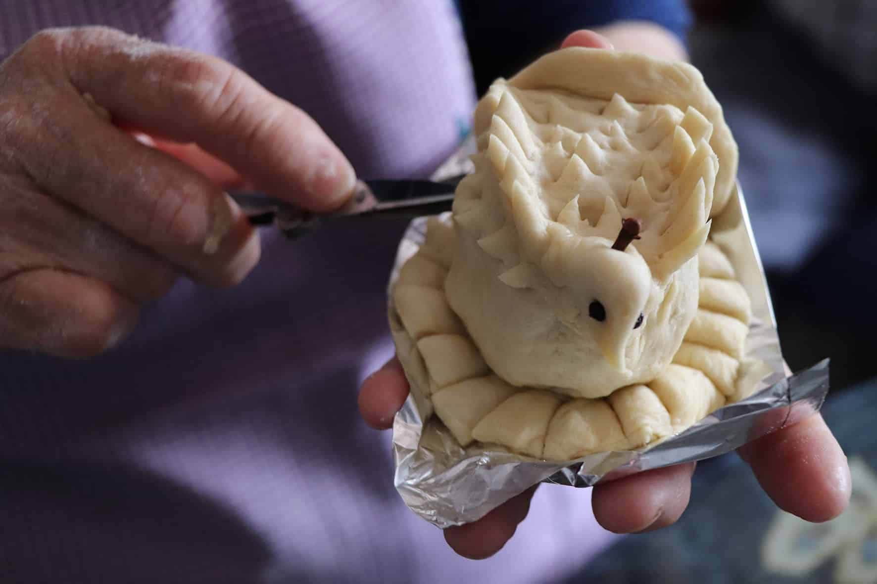 - Llega el momento de hacerle la cabeza y las plumas. Estas últimas se hacen dándole pequeños tijeretazos a la masa.