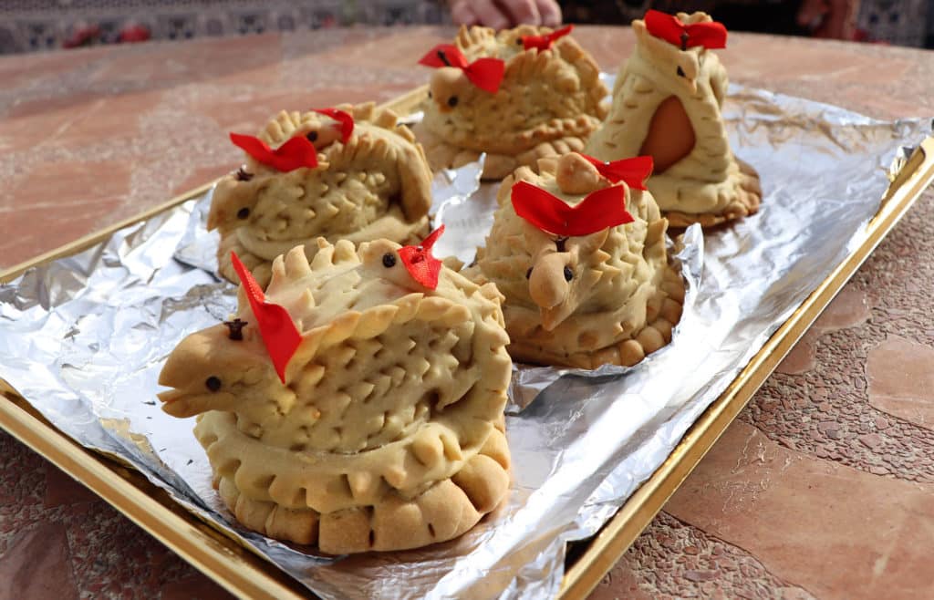 Adornadas con lazos de colores y con dos granos de pimienta y un clavo en especia para los ojos y la cresta, grandes y pequeños se reúnen los días previos a la festividad para disfrutar de una tarde juntos, al mismo tiempo que crean con sus propias manos estas figuras tan tradicionales. La harina y el agua se mezclan formando una masa de pan que cubre el huevo antes de meterse en el horno, no sin antes decorarlas marcando tanto la forma de la cabeza como las plumas que las hacen tan peculiares.