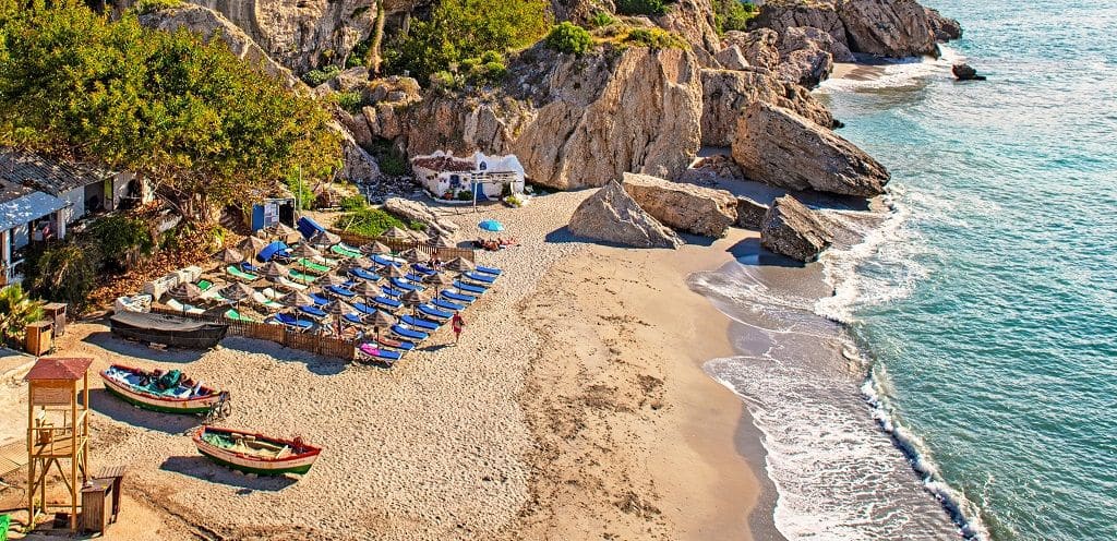 Era la playa preferida de la pandilla. Su nombre real es playa de la Caleta y está en Maro, una pedanía de Nerja. Su acceso es un poco complicado, pero el problema también es una ventaja porque ayuda a frenar la masificación.