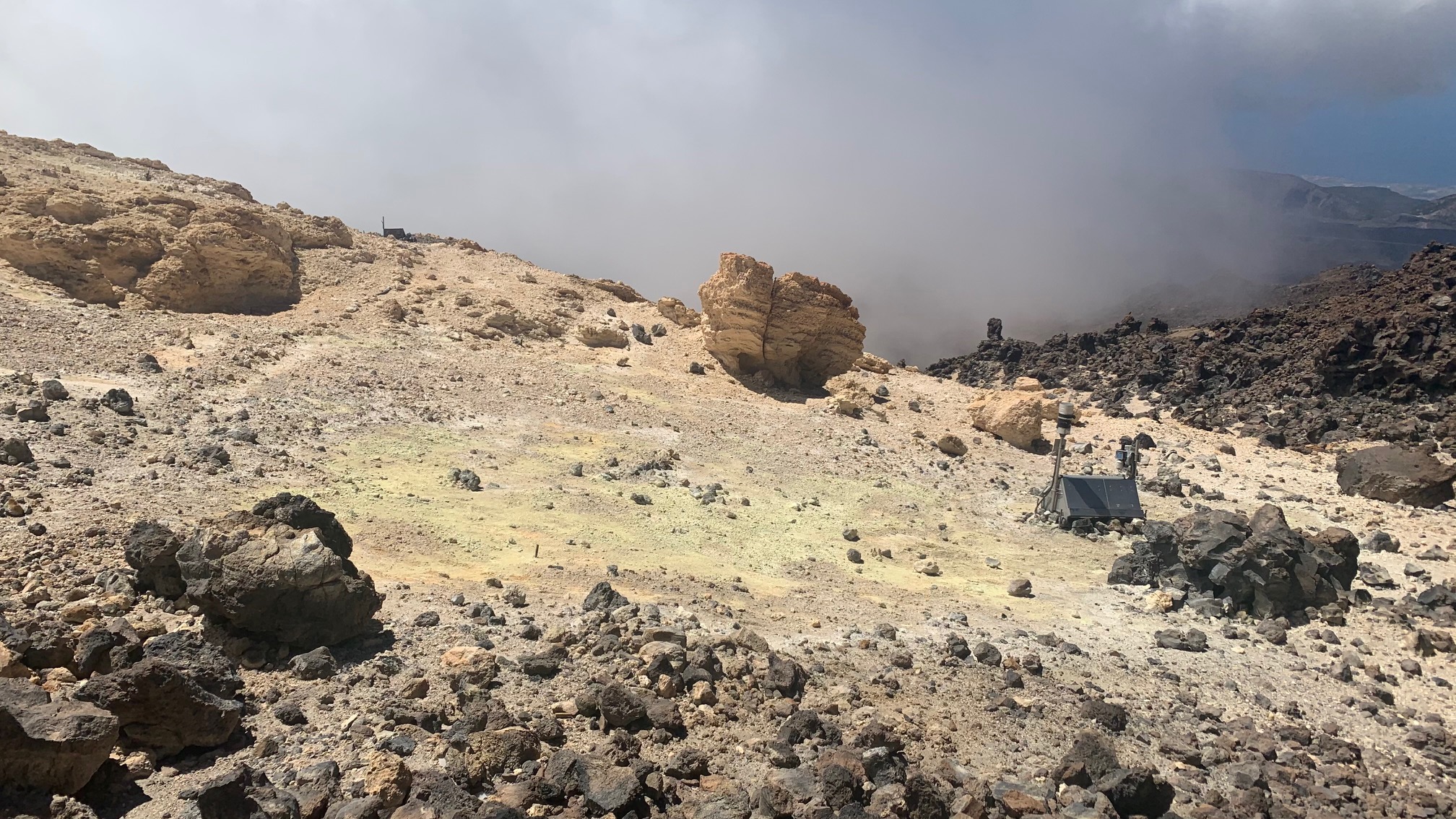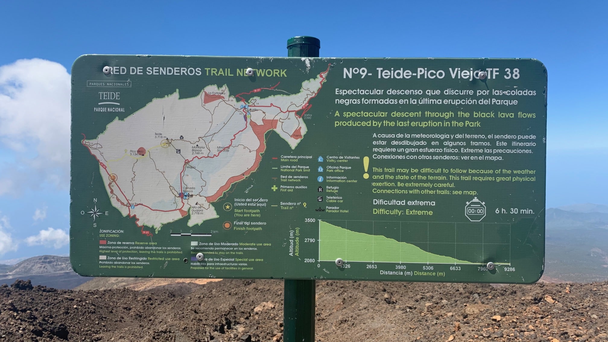 Justo en este punto, y para los más aventureros, se inicia el sendero número 9, el que conduce hasta el epicentro del cráter de Pico Viejo. Un sendero de dificultad extrema que desciende hasta los 2.050 metros (nos encontramos a 3.500 metros) y que se completa en 6 horas y media solo la ida.