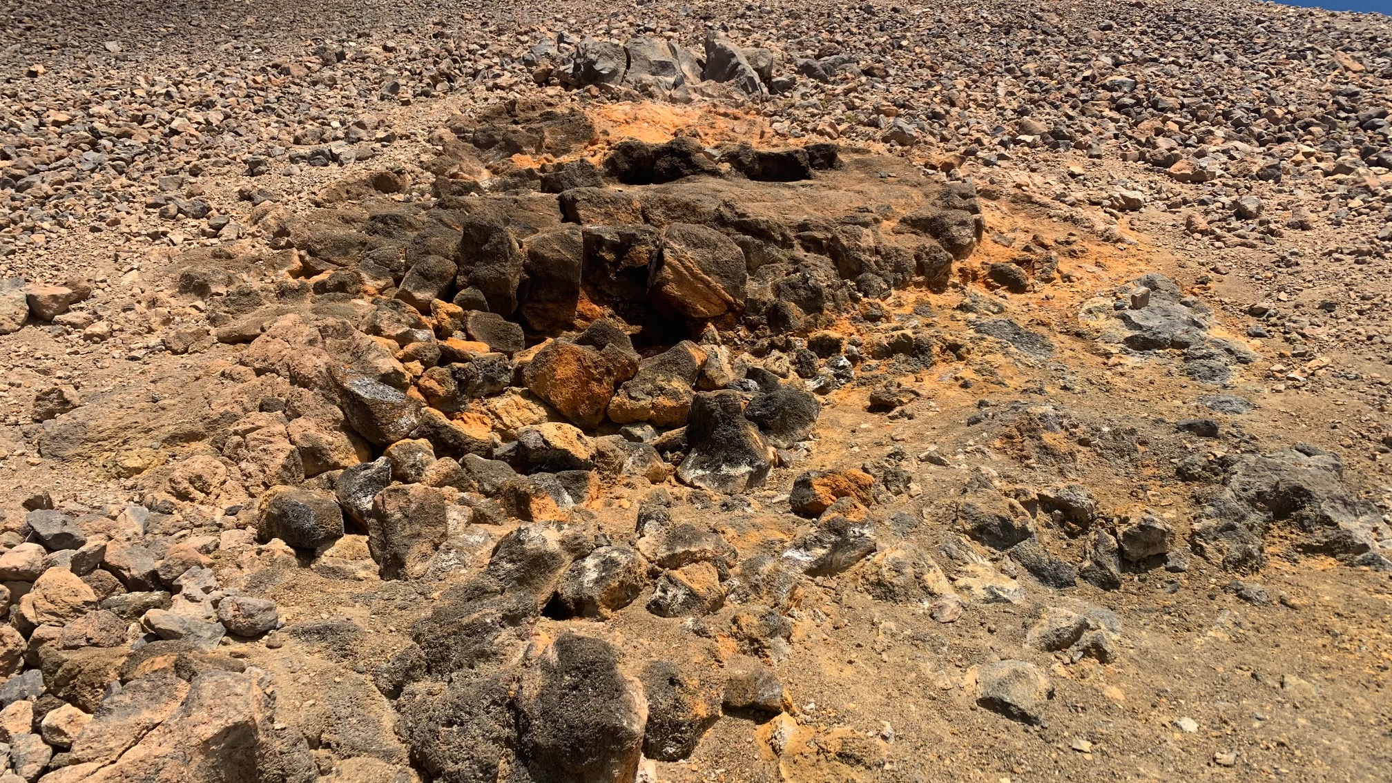 Las tonalidades del paisaje juegan a llenar nuestra retina de blancos, amarillos, rojizos, grises y negros. Una paleta cromática muy fotogénica. En el tramo inicial se pueden observar algunas fumarolas discretas y respirar su fuerte e inherente olor a azufre. Muestras inequívocas de que nos encontramos en una zona volcánica que, si bien está dormida, continúa activa.