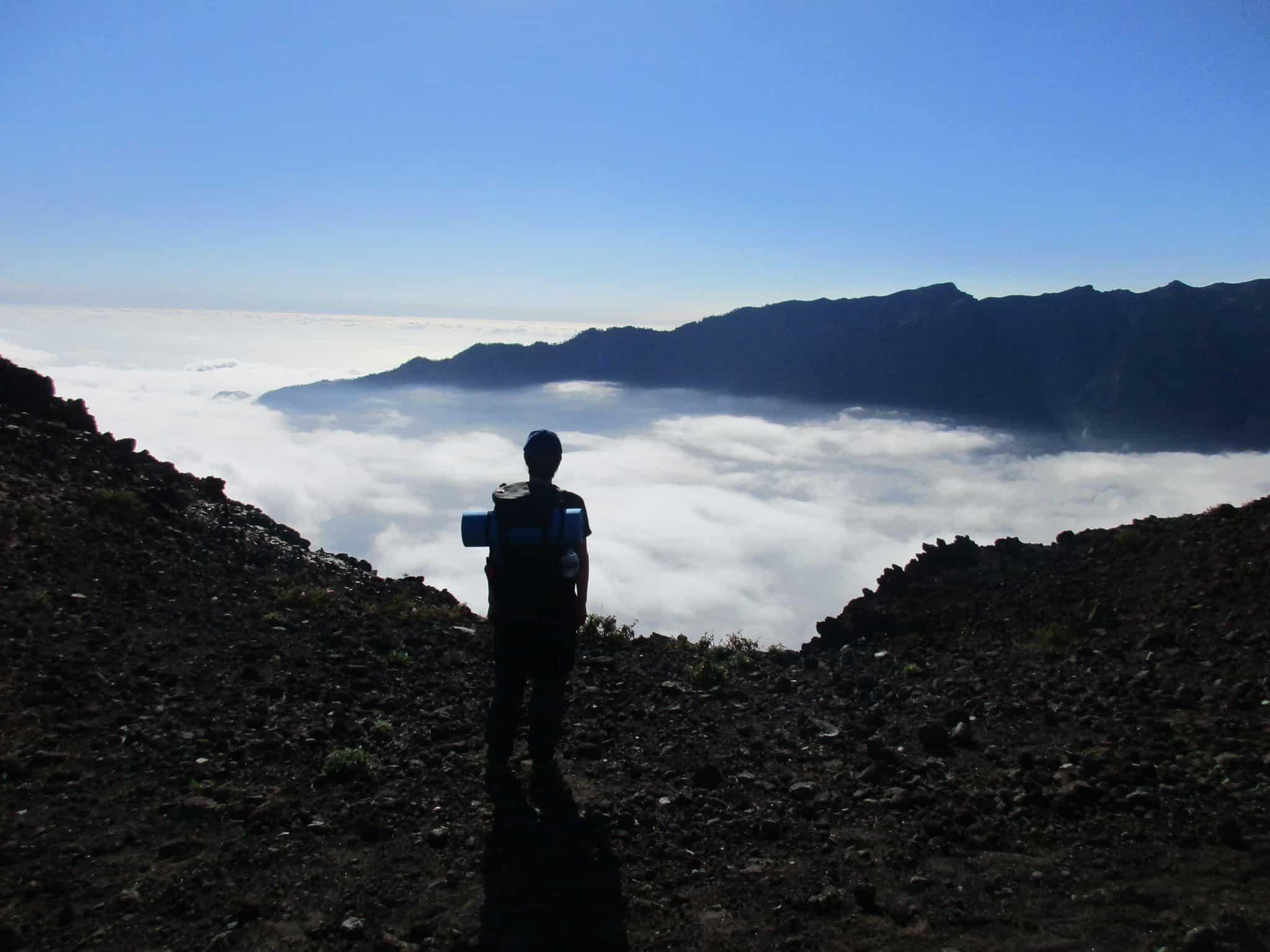 Al principio nos ha fastidiado un poco que el pico más alto de La Palma estuviera tan urbanizado, con sus carreteras, su aparcamiento de coches en la misma cumbre, sus senderos pavimentados, sus miradores con barandillas, sus grupos de turistas que nos veían llegar con las mochilas y nos sacaban fotos (!). Luego hemos apreciado nuestra suerte: los caminantes tenemos toda la cresta de los volcanes para nosotros solos, podemos recorrer durante dos días el espinazo de la isla sin encontrar a nadie más impertinente que un cuervo hambriento, así que no vamos a refunfuñar por encontrarnos aquí con coches y autobuses arrancando motores, maniobrando y dando bocinazos. La cumbre solo es un punto más de la montaña. Cuando disfrutas de la montaña entera, la cumbre es una idea irrelevante.