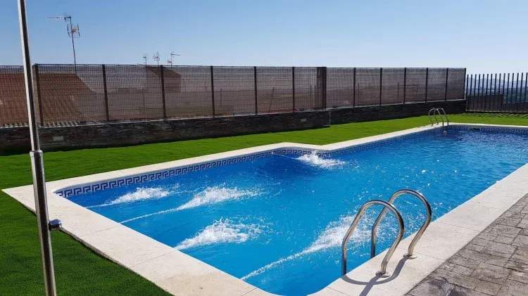 Hay piscina comunitaria y las vistas desde la terraza superior son impresionantes para disfrutar de la riqueza histórica de Segura y de la dehesa extremeña.