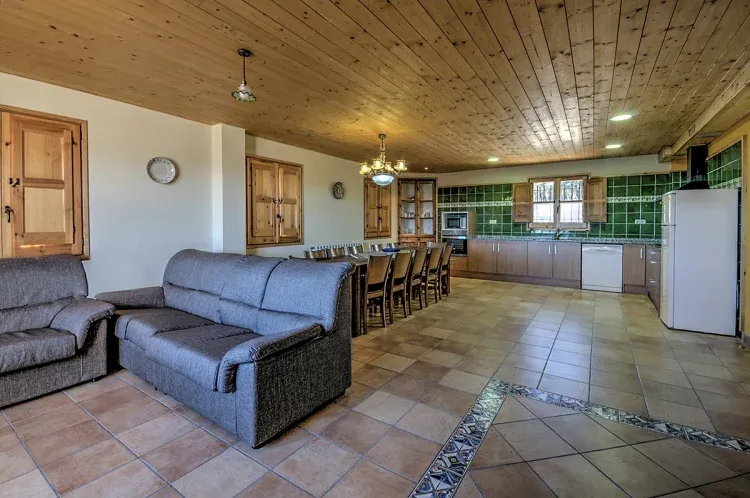 • Hay una gran sala que integra cocina, comedor y sala de estar con chimenea.