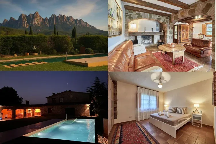 Situada junto a la mítica montaña de Montserrat, la masía ofrece unas vistas espectaculares que cambian con la luz del día —desde amaneceres dorados hasta puestas de sol que tiñen de fuego las rocas de la montaña.