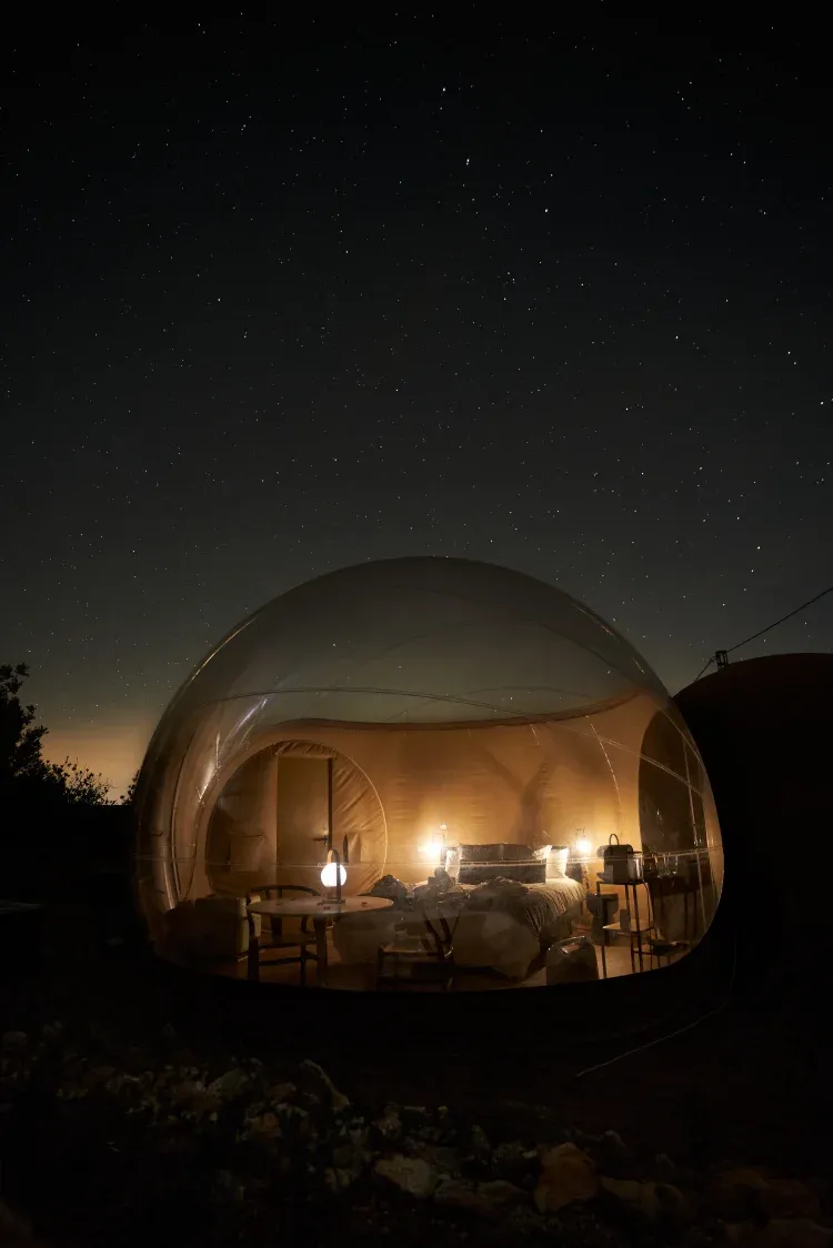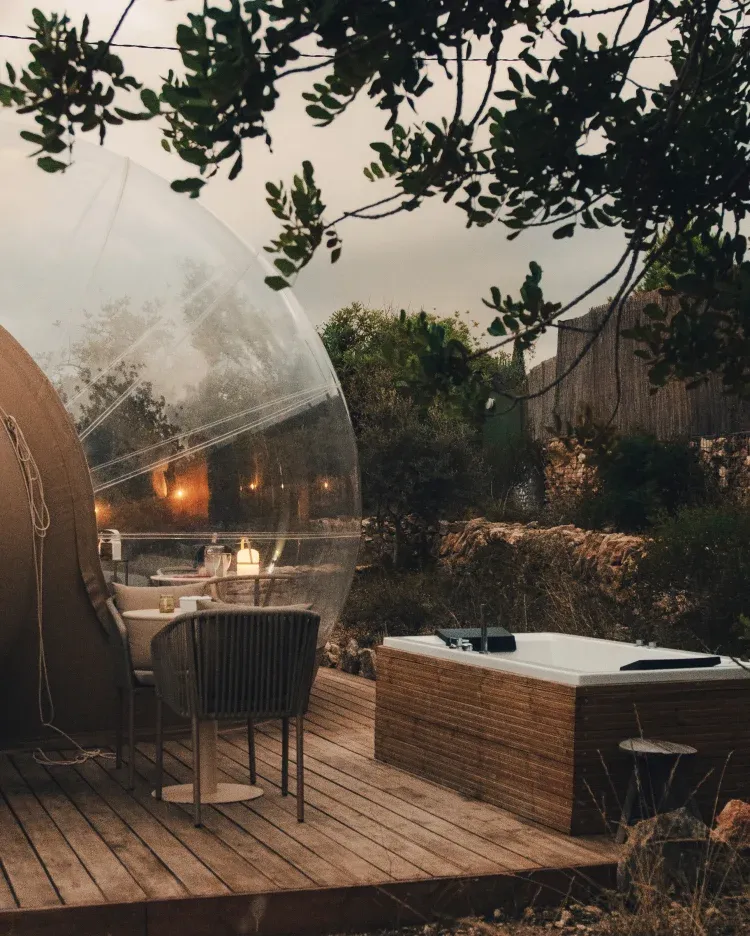 La Suite Algarrobo es una burbuja doble con vistas panorámicas al cielo, situada en una parcela privada de 200 m² en plena naturaleza, cuidando cada detalle para integrarse respetuosamente en el entorno.