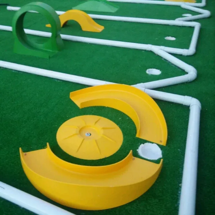 Zona de juegos con futbolín, muebles de jardín una cabaña de madera con juegos para niños pequeños, minigolf,mesa de pin pong.