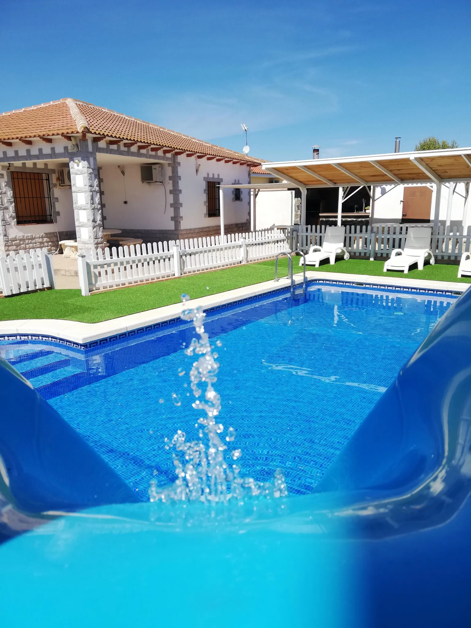 *Piscina con tobogán acuático para niños pequeños, está vallada, tiene ducha,