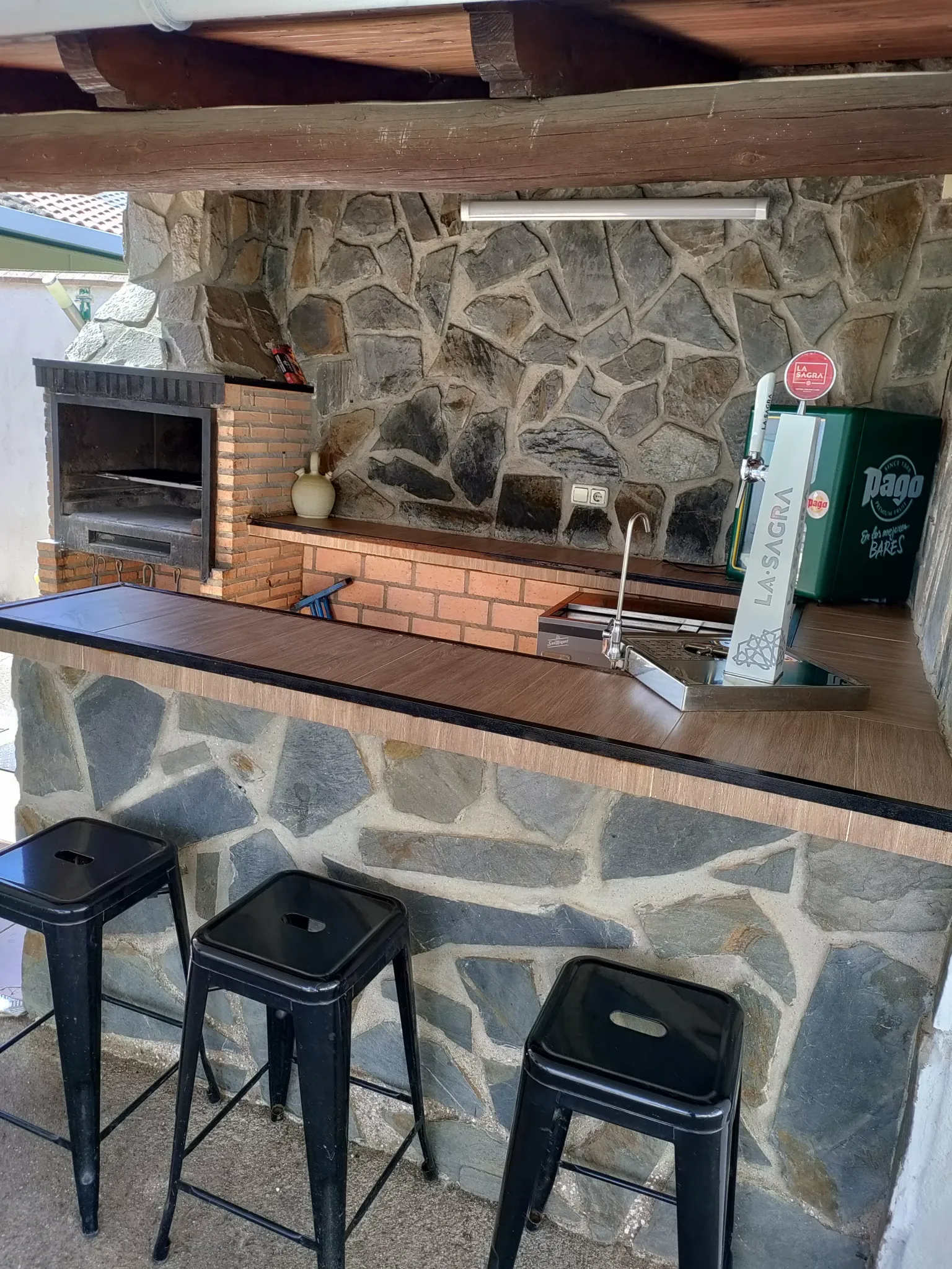 En el exterior se encuentra: la barbacoa cubierta con iluminación.