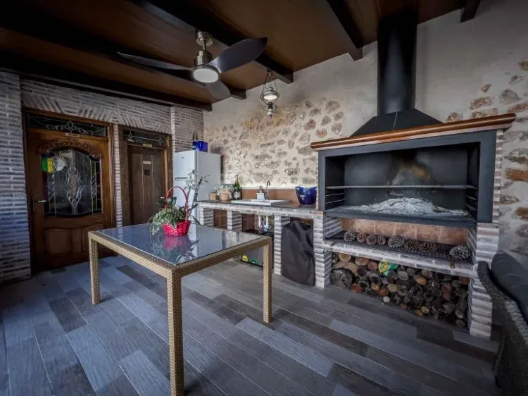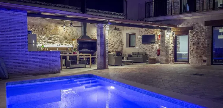 Patio con piscina, porche cubierto con barbacoa, zona de relax y aseos para caballeros y