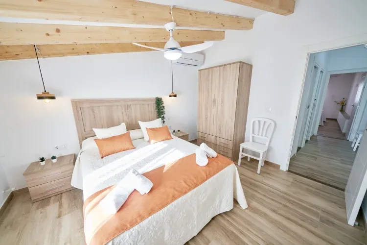 - Planta superior: zona abuhardillada diáfana con cama de matrimonio y 4 camas individuales con baño. Habitación con cama de matrimonio independiente con baño propio.