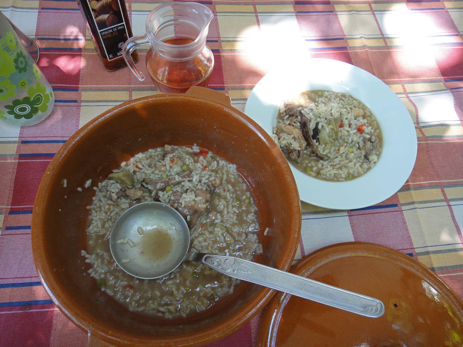 En la casa también ponen de comer. Nosotros hemos comido el último día un delicioso arroz caldoso con conejo con ingredientes del huerto que tienen en la casa. Estaba todo delicioso. Además, comiendo en la mesa del jardín a la sombra de una de las nogueras.