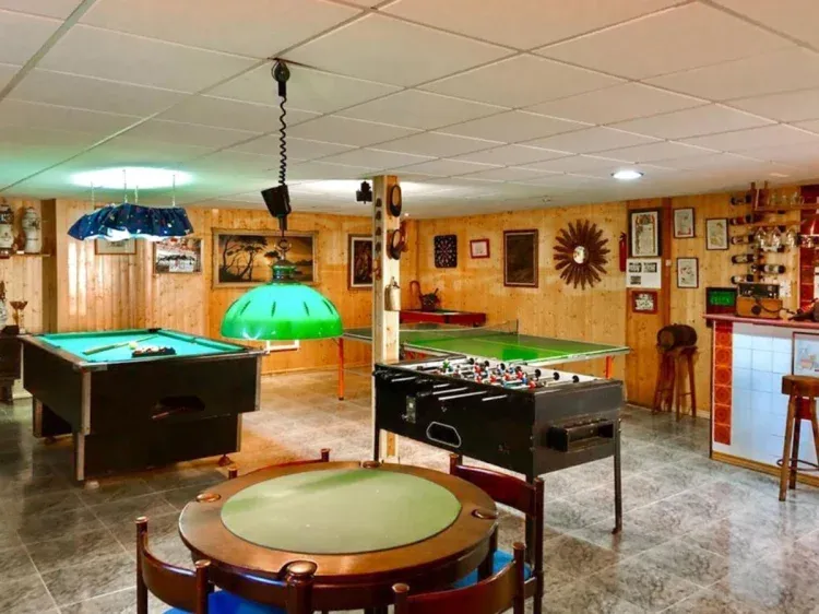 Gran sala de juego donde podrás distraerte, con billar americano, futbolín, mesa de ping-pong, mesa para juegos diversos, barra de bar, billar para niños, dardos etc.