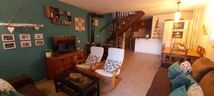 La primera planta se distribuye en cocina totalmente equipada y amueblada con todo lo necesario, un aseo y amplio salón-comedor con amplia mesa de comedor extensible, dos sofás, uno de ellos convertible en sofá-cama doble, chimenea de leña, Tv y juegos de mesa.