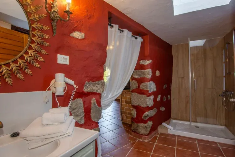 Al entrar a la casa accedemos a un pequeño recibidor desde donde llegamos a la cocina y al comedor. A continuación, se encuentra el dormitorio con cama doble, que al estar dentro de una cueva tiene un ambiente muy especial y acogedor. Al lado se encuentra el baño con plato de ducha. Por el otro lado de la cocina se encuentra el salón con televisión, equipo de música y estufa de leña, además de unas amplias cristaleras para disfrutar también del paisaje cuando estamos dentro. Toda la vivienda está equipada con calefacción central.