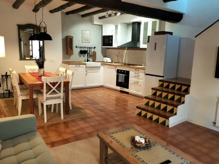 • Planta Baja: Te recibirá una impresionante planta baja construida en piedra, testimonio de la tradición de trabajo de piedra que caracteriza a Tarrés. El espectacular arco de mediopunto de piedra añade un toque único y auténtico al espacio. Aquí encontrarás un gran salón con cocina abierta, creando un ambiente amplio y acogedor. Disfruta del calor de la chimenea en los días más frescos. La cocina está completamente equipada para que puedas preparar tus comidas favoritas.