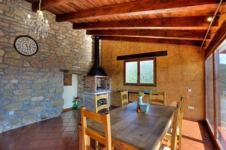 - Sala de estar con el frontal totalmente acristalado, chimenea, barbacoa, televisión, sofás de piel... para dar el máximo confort. La calefacción central es a gas y la leña para el fuego y la barbacoa es gratuita.