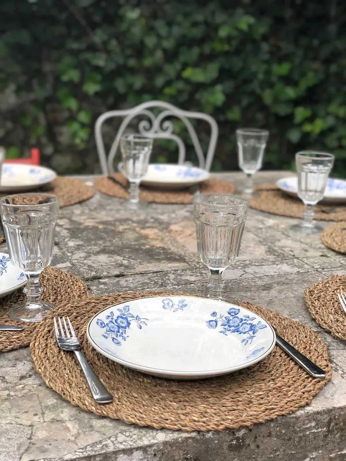 Zona de barbacoa con un cenador bajo la sombra de los árboles en mesa de piedra antigua.