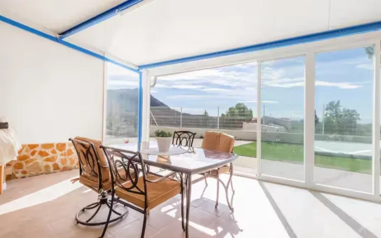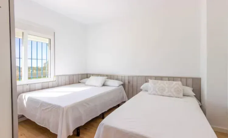 Dispone de 2 habitaciones de 16 metros, salón comedor, cocina, porche acristalado, porche exterior con vistas, baño y jardín. Zona de parking exterior. Piscina cubierta pequeña para niños poca profundidad y en julio y agosto piscina grande a 2 minutos precio pago.