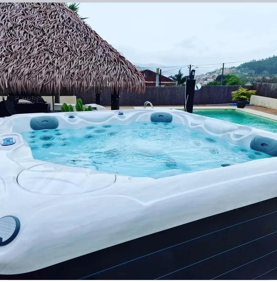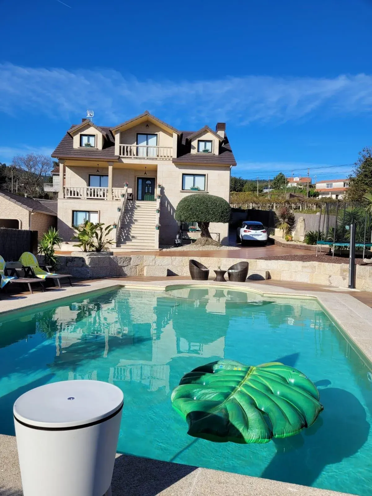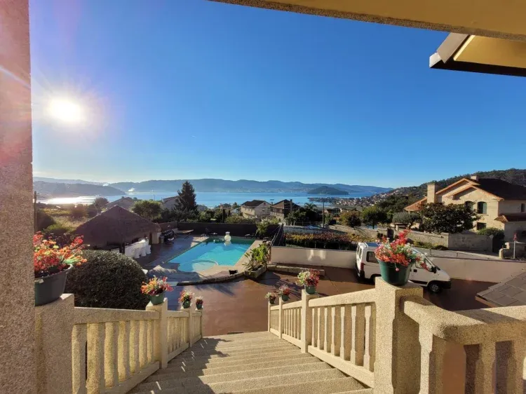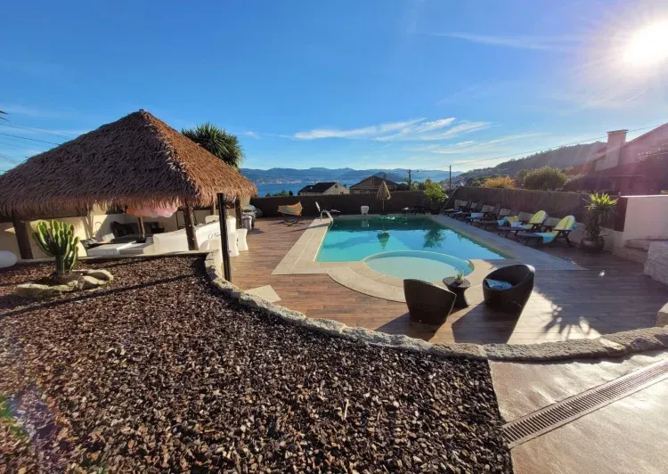 Los 1.200 m2 de exteriores están diseñados y equipados para el disfrute de los huéspedes. La piscina privada, de agua salada con jacuzzi, tiene vistas panorámicas a la ría de Pontevedra. Junto a ella, la zona de relax y sol está equipada con tumbonas, sombrillas, cama elastica , sofás, columpio, hamaca balancín e hinchables varios para que la diversión esté garantizada. El conjunto se completa con un cenador estilo caribeño con cocina exterior y barbacoa , mesa de comedor, nevera, congelador, fregadero e iluminación chill out para la noche.