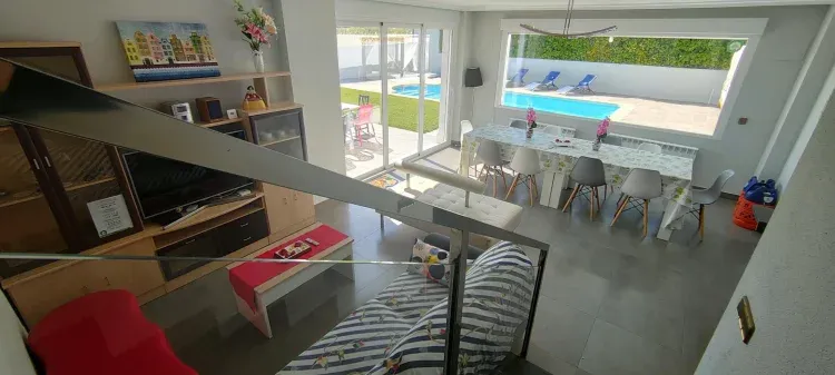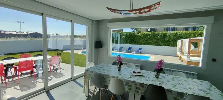 Impactante cocina roja con electrodomésticos en cristal negro. Mobiliario de diseño,amplio jardín con barbacoa, terraza y piscina privada. En pueblo con todos los servicios, junto a la ciudad, 8 habitaciones y 4 baños. Tiene WiFi.