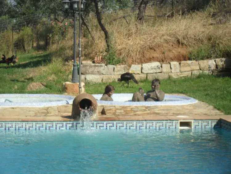 Amplio porche exterior con barbacoa. Piscina, baños de barro y arena y zona de juego infantil. Gallinero y huerto ecológico privados.