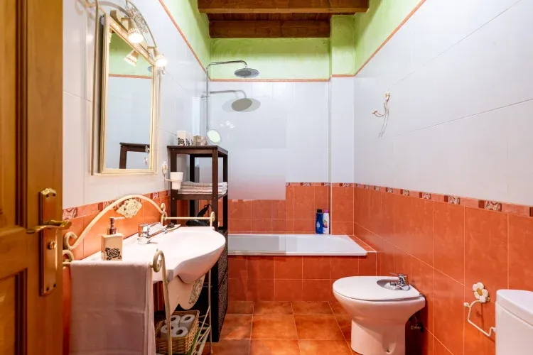La planta alta se accede por una escalera adosada al salón, en la que se distribuyen tres dormitorios y un gran baño. En la planta alta, encontrarás un dormitorio con cama de matrimonio, otro con dos camas individuales y el tercero con tres camas individuales, completando un total de 7 camas en la vivienda con capacidad para 9 personas. El baño es amplio y está equipado con bidé, bañera y ducha con rociador efecto lluvia. Todos los dormitorios disponen de aire acondicionado frio / calor y armario, y las camas cuentan con 2 almohadas por huésped.