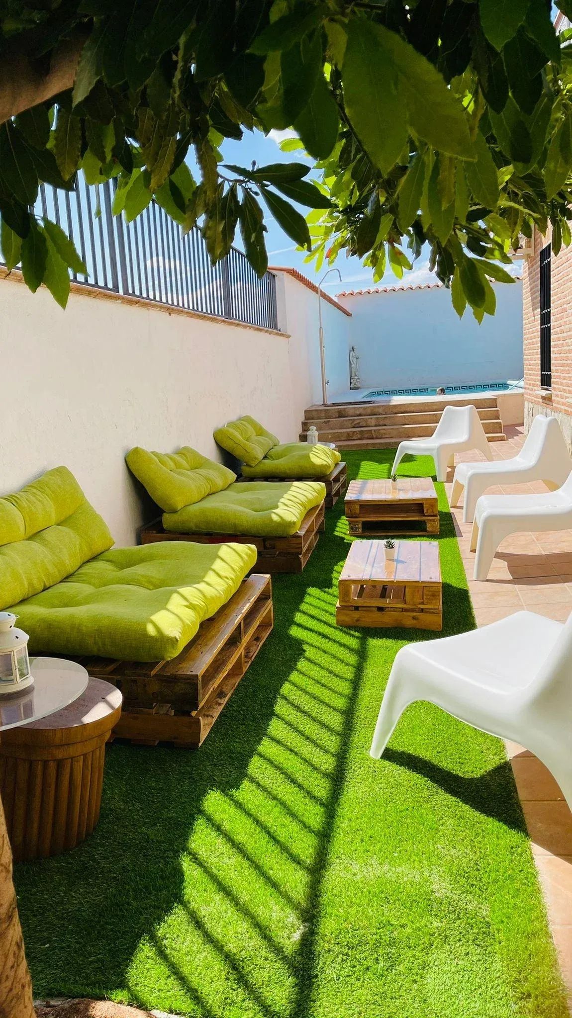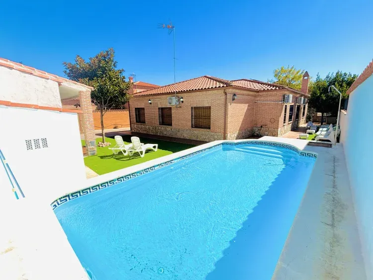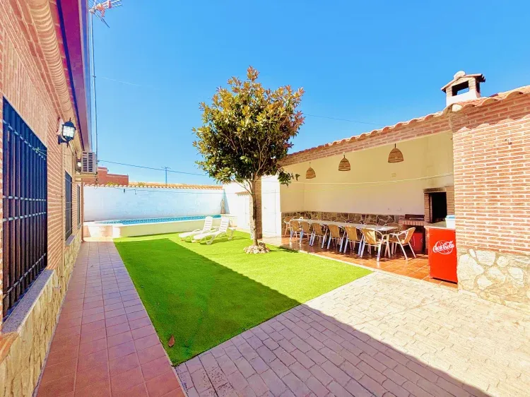 Disponemos de un gran porche de entrada con jardín alrededor de toda la casa y mobiliario exterior, una preciosa barbacoa techada estilo toledano con mesas y sillas para disfrutar de las comidas junto a la piscina de verano, tumbonas y sombrillas además en esta zona se dispone de una segunda cocina exterior con chimenea en el patio, menaje de todo tipo incluido aro de gas y paellera grande.