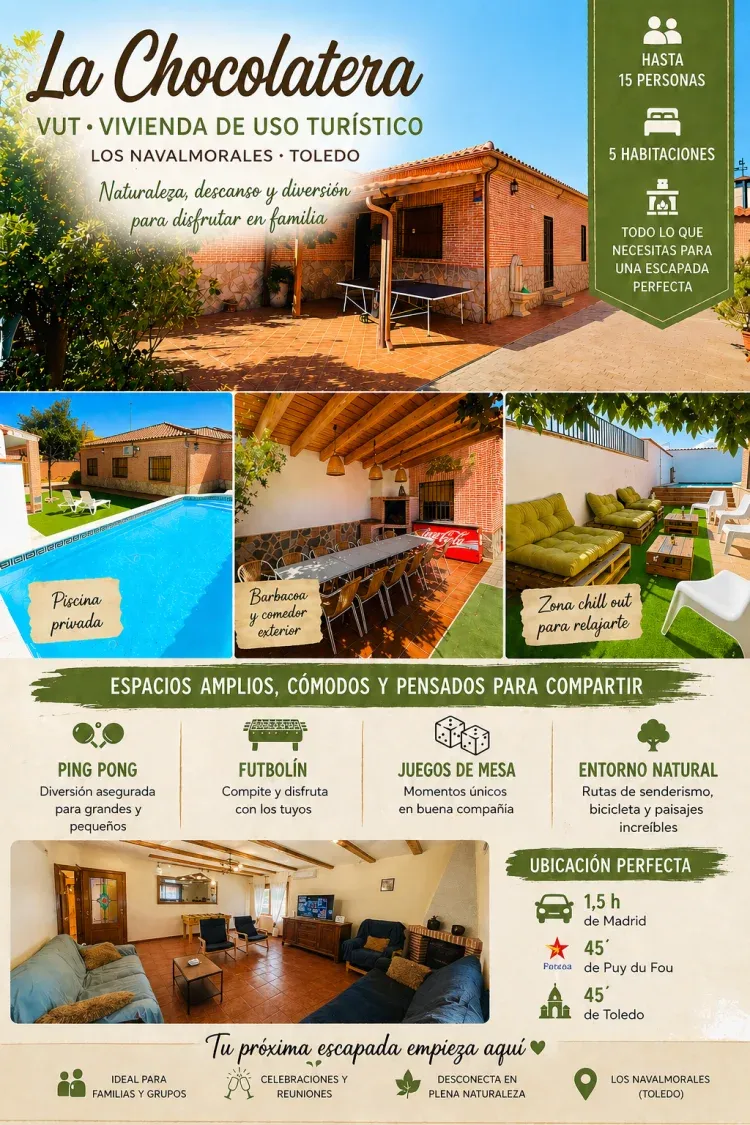 nos encontramos en un entorno privilegiado, a pocos kilómetros de lugares de interés turístico como talavera de la reina (ciudad de la cerámica), parque temático puy du fou, o toledo (ciudad imperial). Está a un paso del parque nacional de cabañeros, especialmente conocido por su flora, fauna, áreas recreativas para baño y rutas para senderismo. Ubicado en plenos montes de toledo.