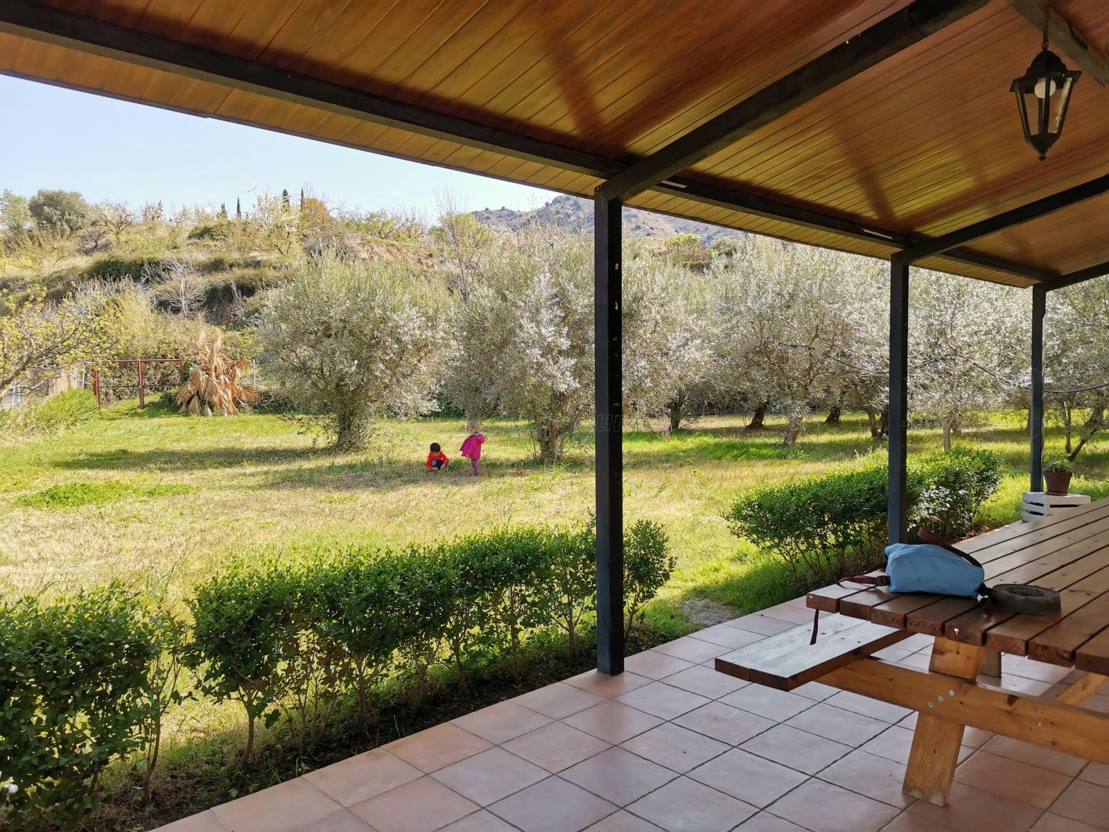 La casa es ideal, por fuera con un gran jardín cercado lleno de olivos, para que los más peques jueguen a sus anchas sin preocuparte, y una BBQ estupenda!!
