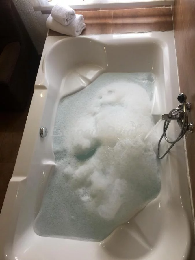Consta de jacuzzi (para dos personas), chimenea panorámica, habitación con cama de matrimonio de 150 cm, cocina completa con todo el menaje de hogar y además horno, microondas, tostadora, sandwichera, tv de 40" girato