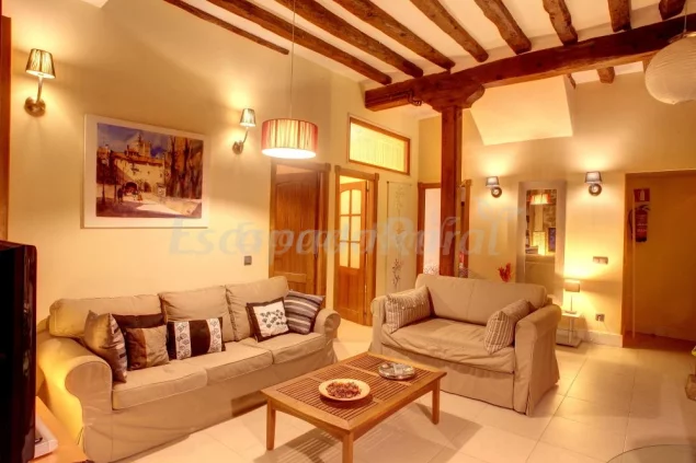 Sigüenza Domus, diseño y vanguardia en un entorno único. En la casa encontrará un salón con altos techos de más de tres metros de altura, sujetos por columnas de madera, y gruesos muros de piedra con mas de 1 metros de grosor que proporcionan a la casa una temperatura ide