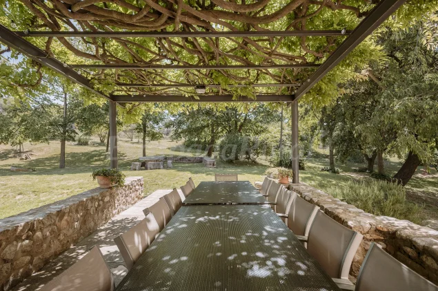 Rodeada de un extenso jardín, con arboles centenarios, piscina de agua salada y protegida con valla, barbacoa, mesa de ping-pong y pista de petanca. En el jardín hay una zona infantil con columpios, cama elástica, caseta...